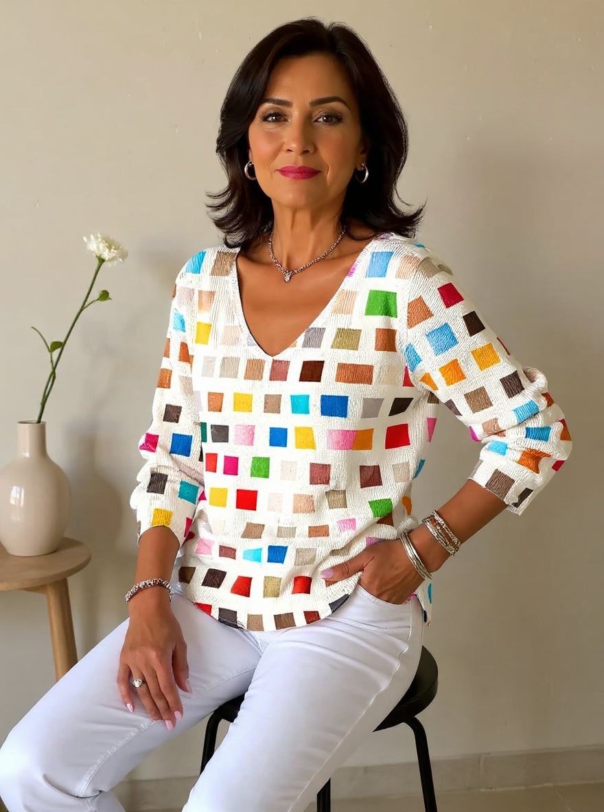 de Kleurrijke trui met V-hals is de perfecte trui voor vrouwen die een vleugje kleur en vrolijkheid aan hun garderobe willen toevoegen. De flatterende V-hals benadrukt de silhouette, terwijl de zachte stof een onweerstaanbaar comfort biedt. Met zijn levendige tinten en verfijnde ontwerp, de Kleurrijke trui met V-hals combineert warmte, elegantie en moderniteit — de ideale metgezel om uw frisse dagen op te vrolijken.